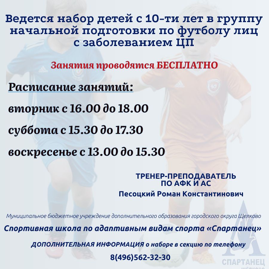 Ведёт набор детей с 10-ти лет в группу начальной подготовки по футболу лиц с заболеванием ЦП