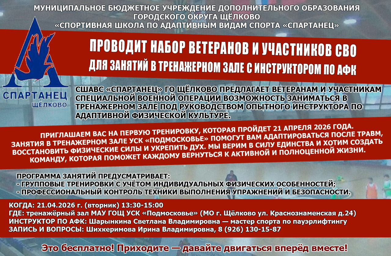 Муниципальное бюджетное учреждение дополнительного образования городского округа Щёлково «Спортивная школа по адаптивным видам спорта «Спартанец» проводит набор ветеранов и участников СВО для занятий в тренажерном зале с инструктором по АФК.