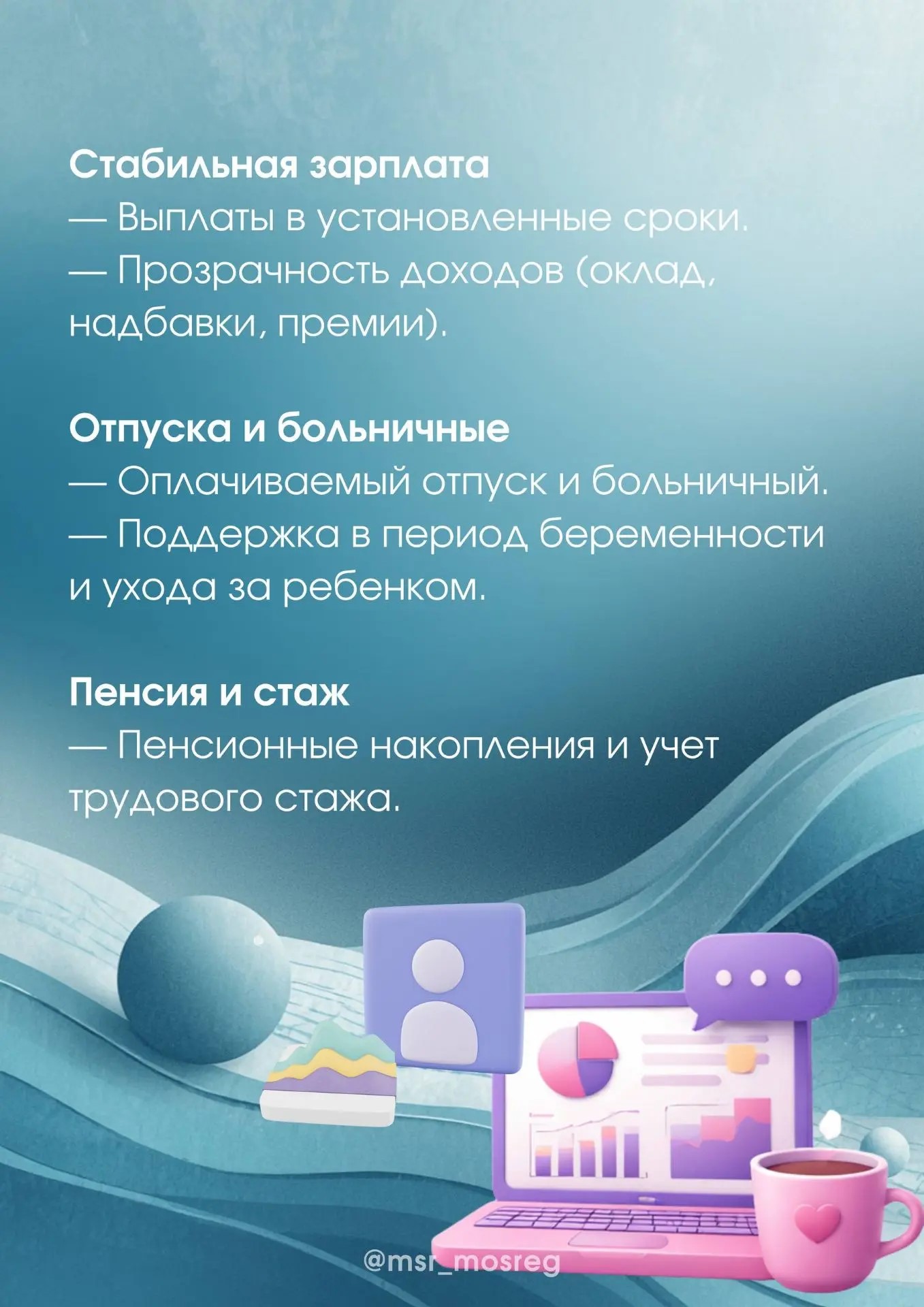 Официальное трудоустройство — это не просто подпись на документе, а ваш правовой щит в рабочих отношениях. Целый спектр гарантий уже в карточках!