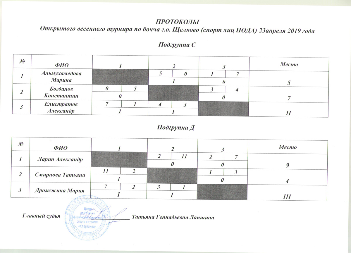 Центр "Спартанец" Протоколы соревнований Протоколы Открытого весеннего турнира городского округа Щелково по бочча (ПОДА)