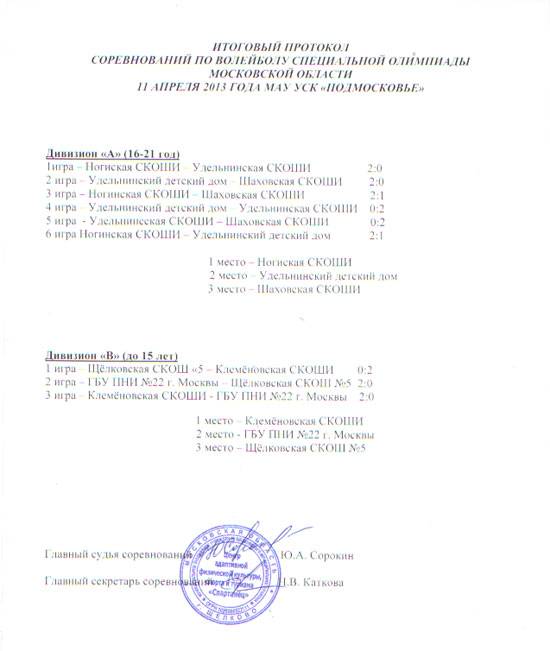 Итоговый протокол соревнований по волейболу Специальной Олимпиады Московской области.