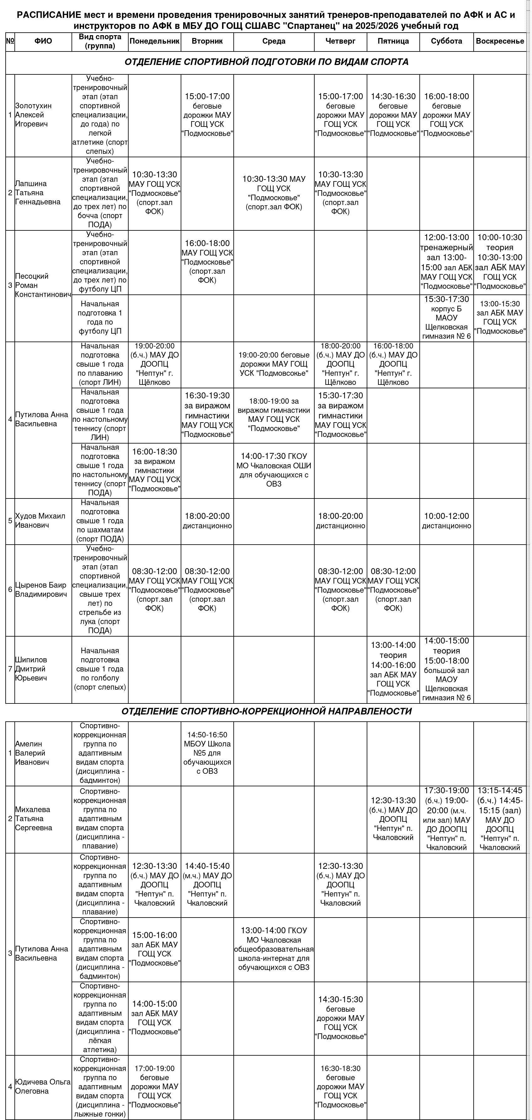 РАСПИСАНИЕ мест и времени проведения тренировочных занятий тренеров-преподавателей по АФК и АС и инструкторов по АФК в МБУ ДО ГОЩ СШАВС "Спартанец" на 2025/2026